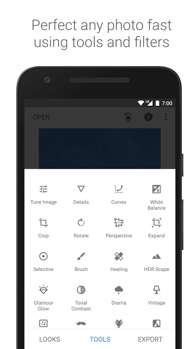 - It has a total of 29 tools and filters that includes healing, brush, HDR, structure, and perspective.