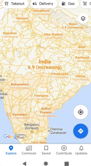 Here you can see the seven-day average of new COVID cases per 100,000 people. Apart from this it also indicates whether the COVID cases are increasing or decreasing. Google Maps uses color-codes to show the severity of the cases in the area.