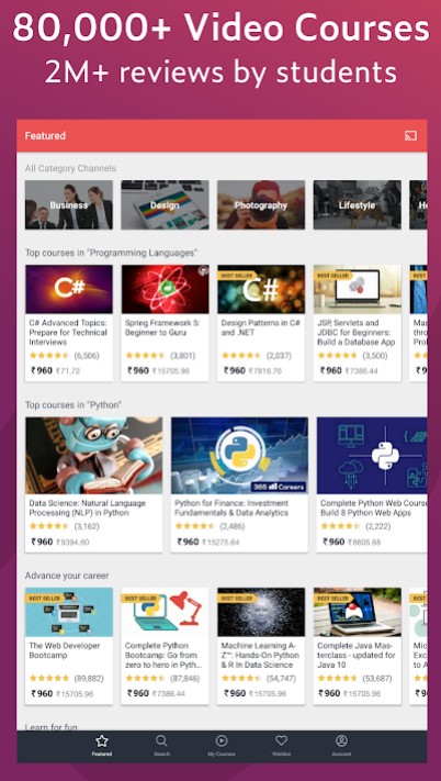 Udemy is a non-academic online teaching platform. In Udemy you can find video courses in all fields like business, office productivity, development, design, drawing, lifestyle, health and fitness, music, language, and photography. Another important fact is that this app also offers free courses. So, you can build your extracurricular knowledge without paying. Students can learn languages like C, Python, C++, JAVA, and designing courses like adobe photoshop.
