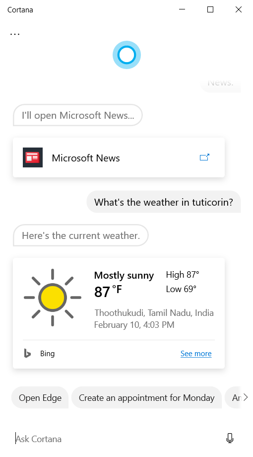 As we all know Cortana is Microsoft’s personal productivity assistant. It helps us to manage Google Calendar, send reminders, open apps, perform a quick search, and track packages and flights. You can use the voice command ‘Hey Cortana’ or just use the shortcut in the taskbar to launch Cortana. Besides, Cortana is smart enough to perform simple calculations. It can also translate by voice.
